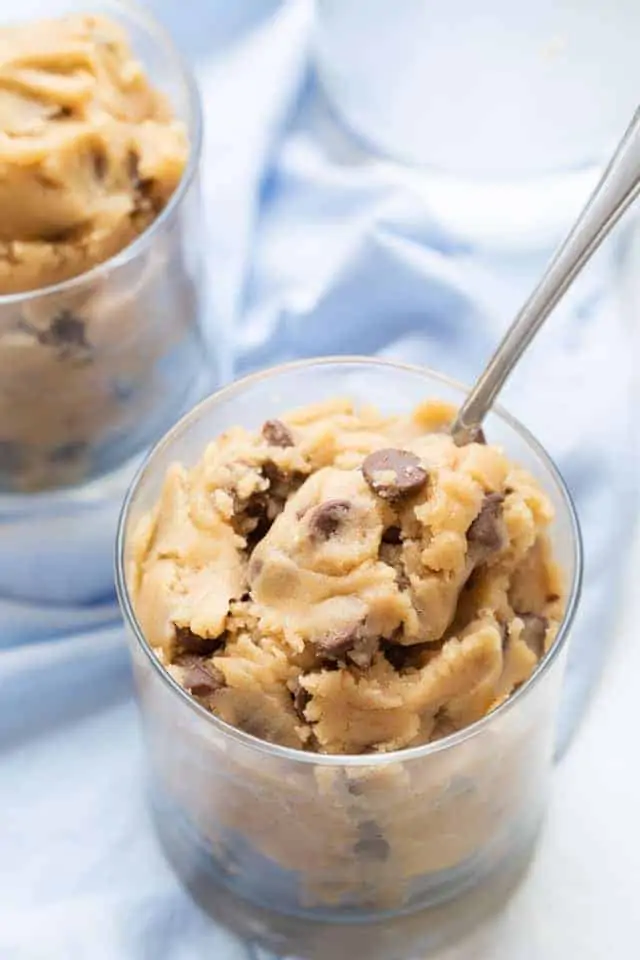 edible cookie dough in a glass cup with a spoon