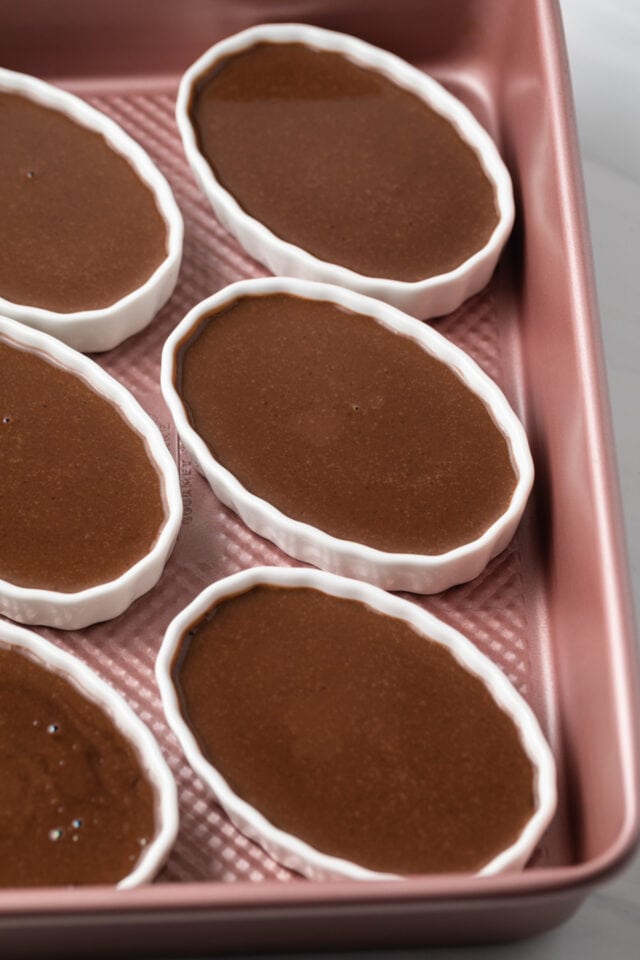 - Carefully remove the baking dish from the oven and allow the ramekins to cool in the water bath. Once the ramekins are cool enough to handle, remove them from the water, cover with plastic wrap, and refrigerate for at least 4 hours or up to 2 days before serving.