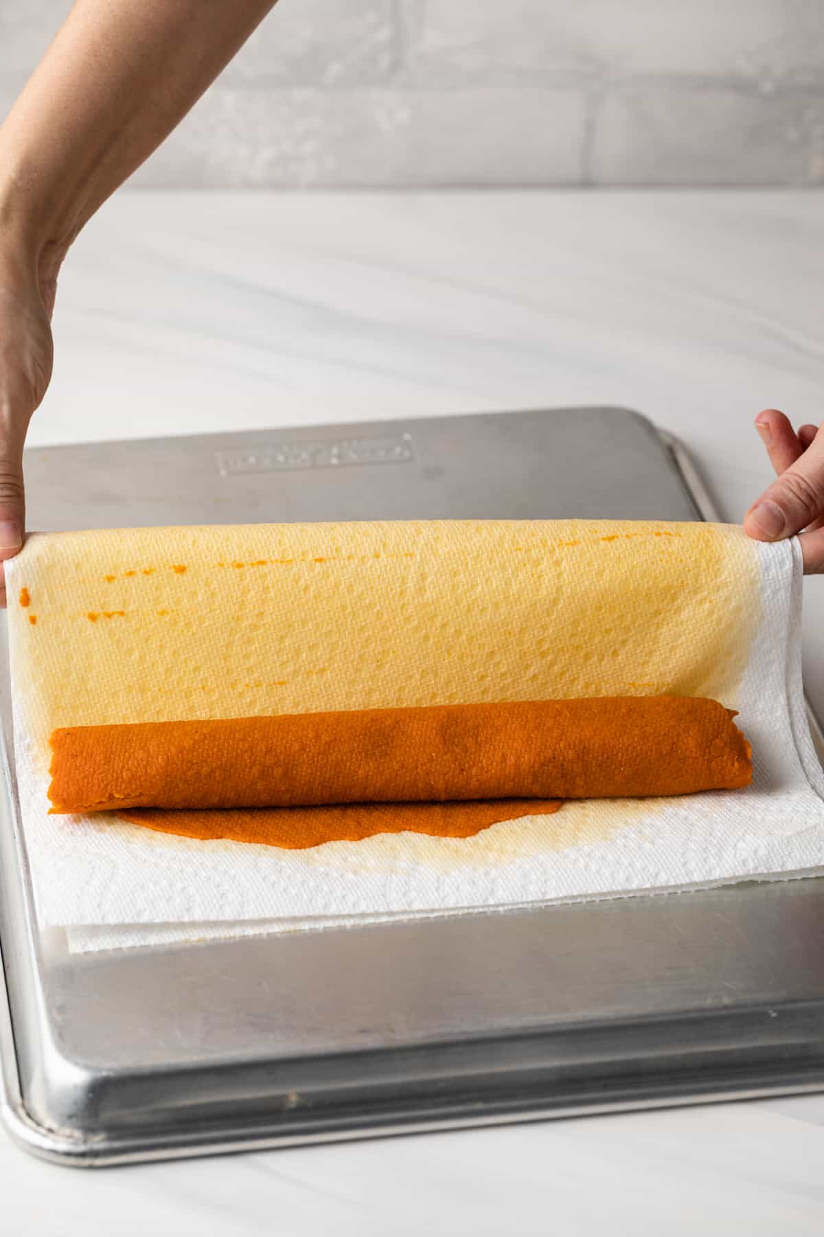 - Blot the pumpkin. Spread the pumpkin puree over a triple layer of paper towels on a rimmed baking sheet. Press a second triple layer of papers until the towels are saturated, then remove the paper towels and gently roll the puree off.