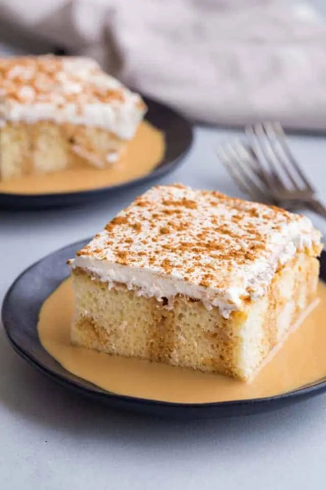 Tres leches means three milks. The cake gets its name because it’s soaked in a mixture of three different milks.